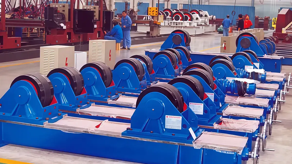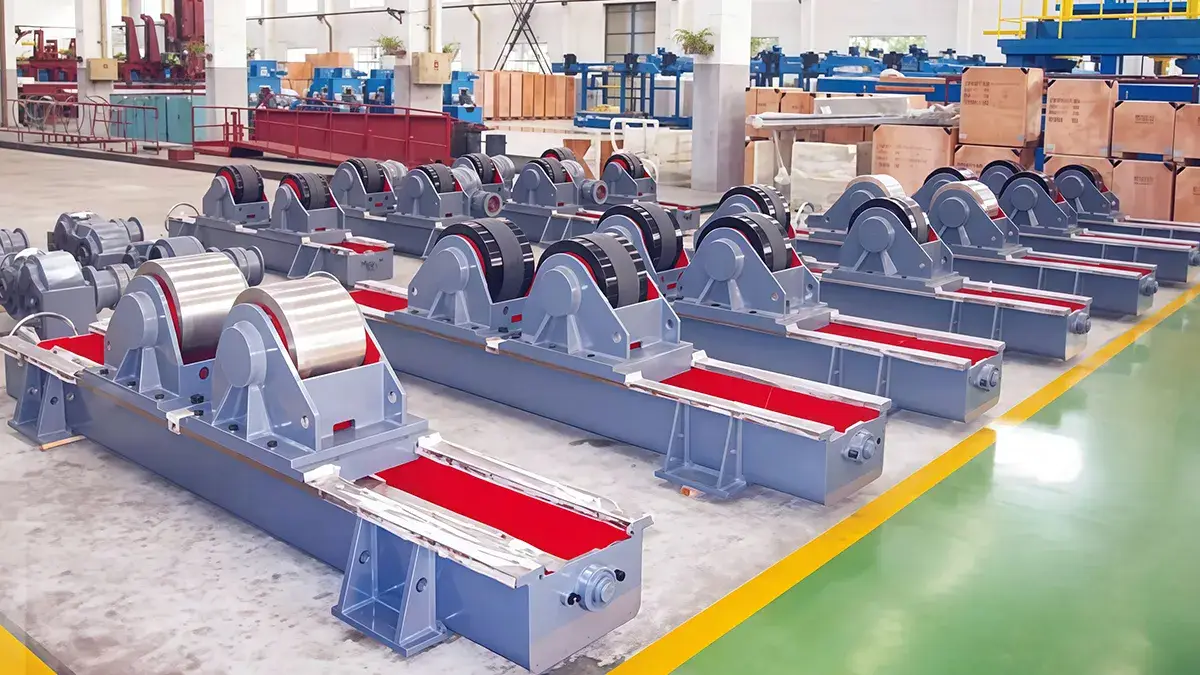 Adjustable turning rolls hold and rotate cylindrical workpieces for welding, grinding, lining, or assembly. The turning rollers can be adjusted with screws or special mechanisms to be suitable for different sizes, ensuring the workpieces stay centered and rotate smoothly while operators work. Operators use these turning rolls to ensure stable rotation, proper alignment, and easier access to all sides of the part. Available with steel, rubber, or polyurethane rollers, they can also be customized for specific production needs, providing safe and efficient handling of heavy or long components.