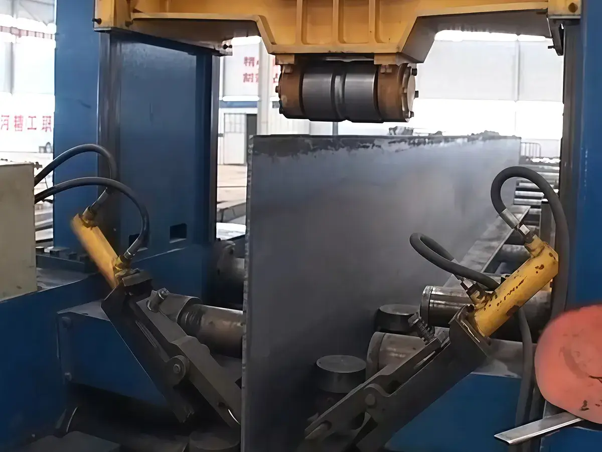 - Web Correction & Precision: The web clamping mechanism features four sets of guide rollers arranged in a dual-layer structure. This design allows the steel beam machine to straighten uneven web plates during the centering process, ensuring superior assembly accuracy.